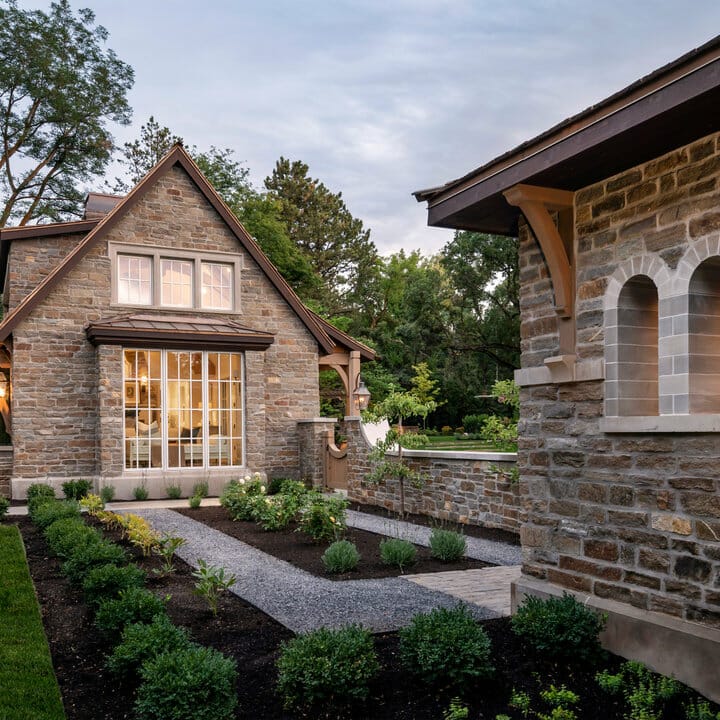 I adore the architectural details here. Furthermore, the wide gray steps and stone walls deliver a cohesive feel in seconds.