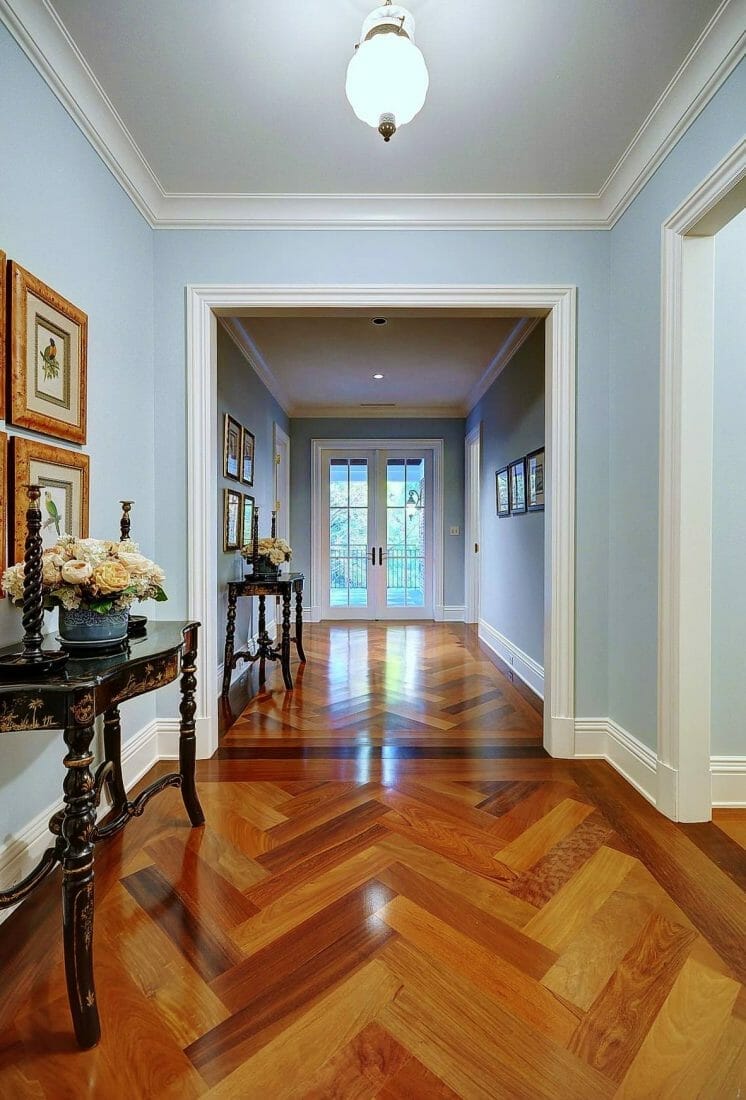 The white trim and molding accompany baby blue walls brilliantly. Moreover, the herringbone wooden floor makes the hallway welcoming.