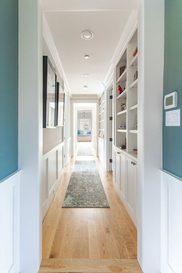 The recessed shelves and built-in dresser quickly impart a modern vibe. Baby blue wall panels soften everything up. Because of the colourful book covers, the hallway looks lively.