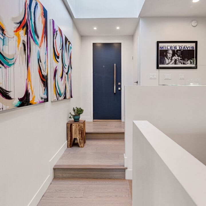 Due to windows and cool white walls, the hallway seems more expansive. Because of the dominant white, the homeowner can integrate colourful accents into her transitional space.