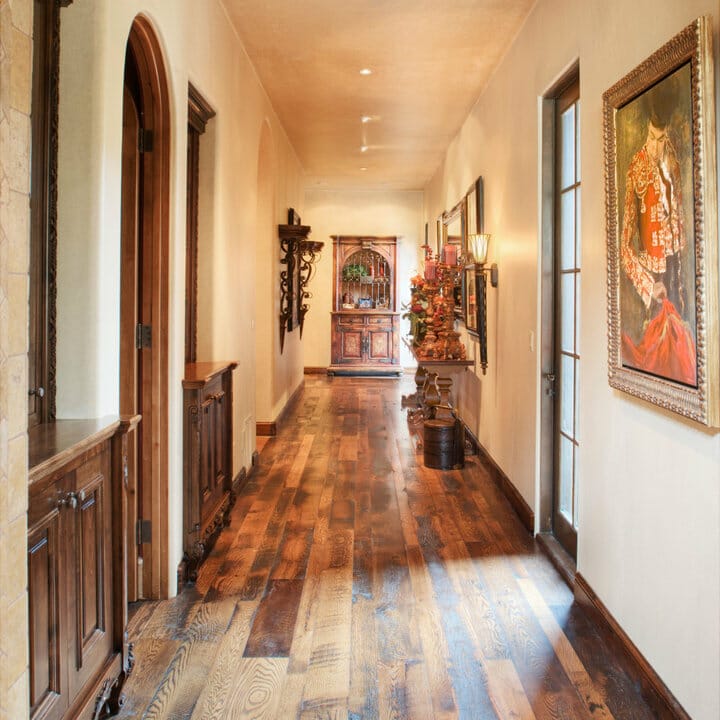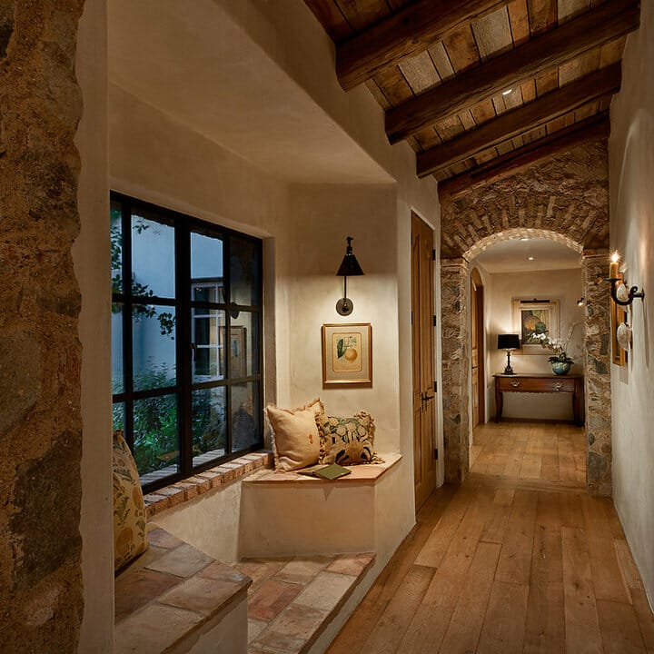 Due to the creamy white, this passageway still seems inviting and airy. Furthermore, bricks, bare woods, and flagstones contribute to the hallway’s rustic appeal.