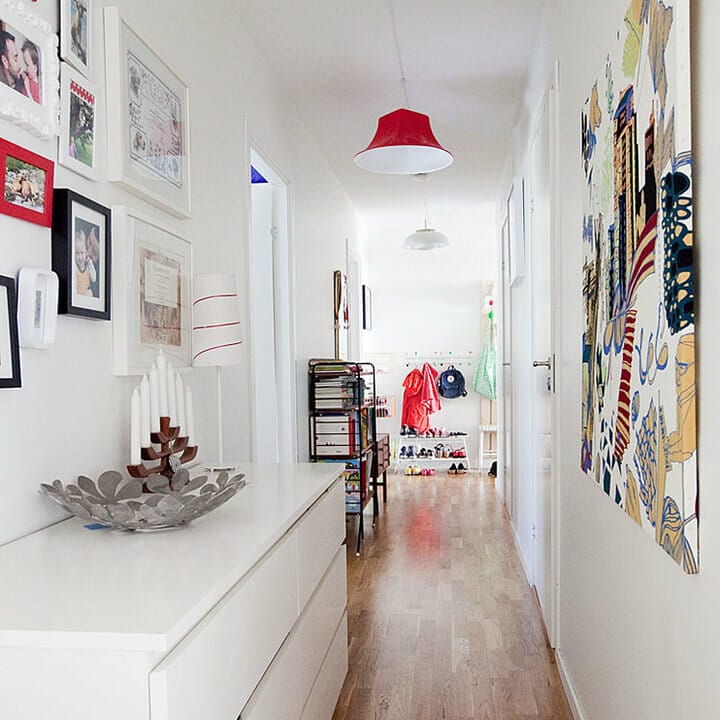 This space serves as a playing field for bold shades. Here, bursts of red and blue perk the hallway up suddenly, while the framed pictures transform the hallway into an art gallery.