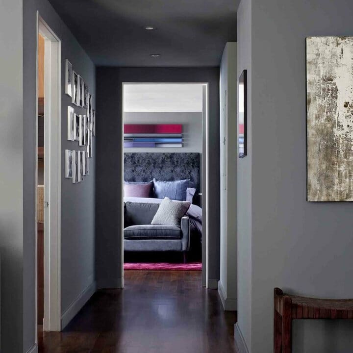 Just because the hallway has no sunlight doesn’t mean dark hues are your enemies. This windowless corridor, for example, boasts a deep warm grey ceiling and walls. They inspire serious sophistication as well as intimacy.