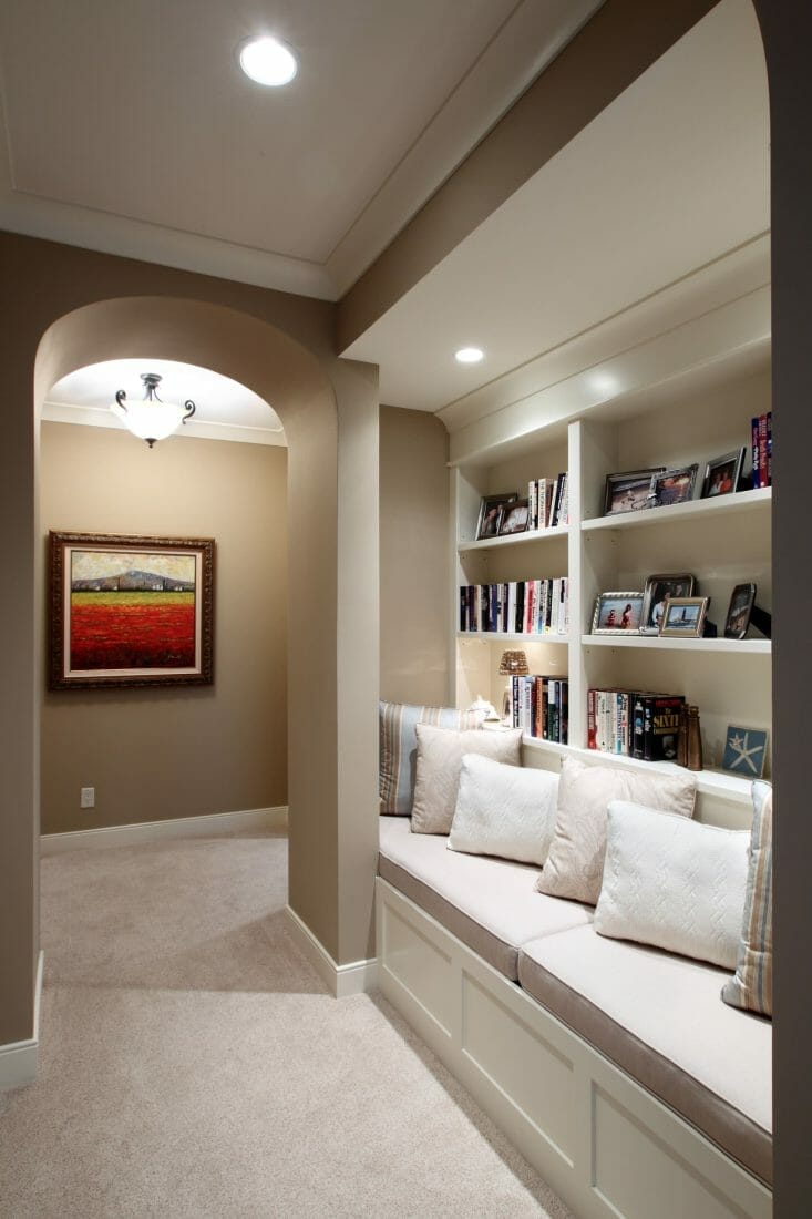 If you have a windowless passageway, a white colour scheme is surely a safe bet. As the picture shows, the white molding, built-ins, walls, and ceiling represent openness. They inspire airiness, too.