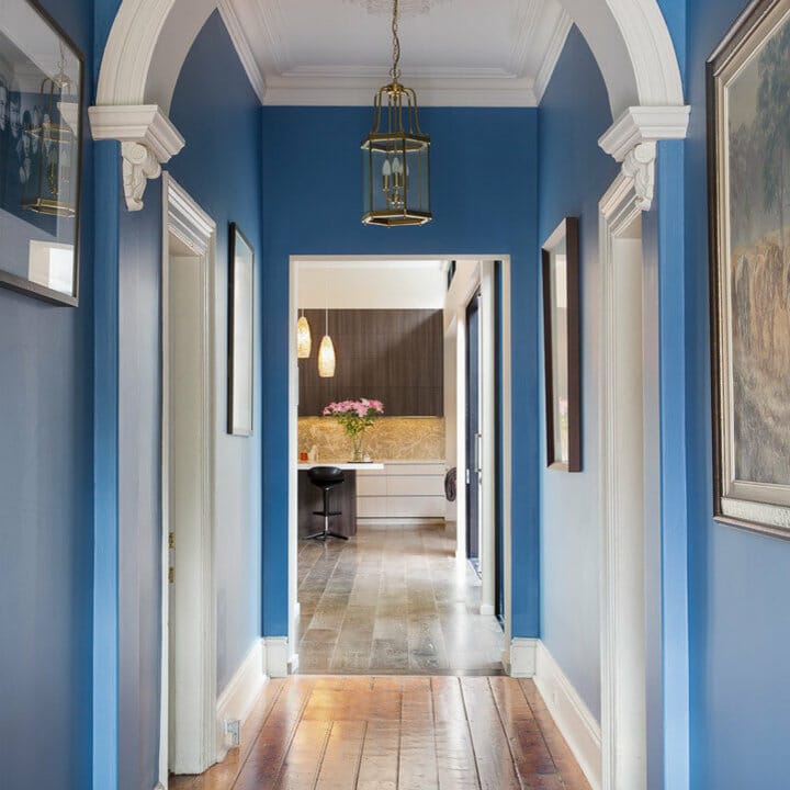 Speaking of vibrant colours for hallways, you can’t go wrong with medium azure. The shade covers the entire walls of the transitional space. Furthermore, it suddenly injects happy energy into the area.