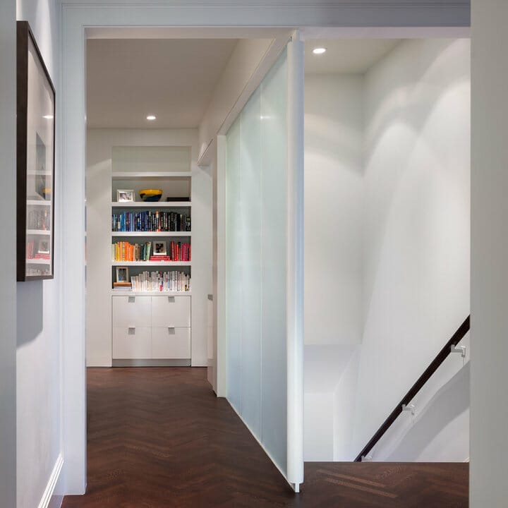 The board and batten walls in this hallway wear cool white. Moreover, the light-toned wooden sliding door and floor keep the transitional space welcoming.