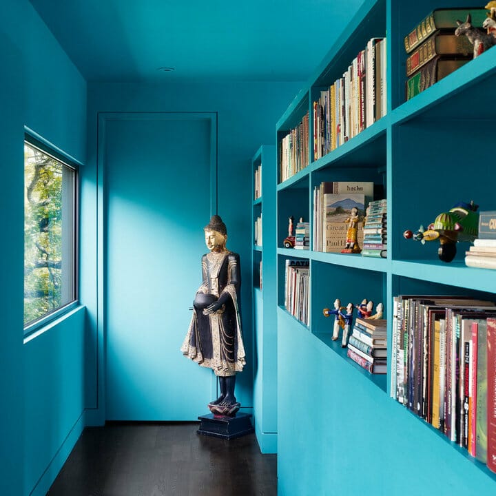 I love the vibrant blue ceiling, built-ins, and walls. They embolden the otherwise lackluster passageway while clashing with the charcoal gray wooden floor magnificently.