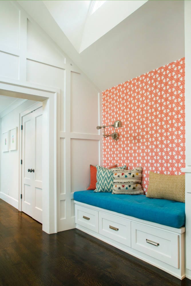 Consider adding a built-in bench to the hallway, so it doesn’t seem pathetic. Also, include a coral patterned wallpaper and colourful throw pillows for a more striking corridor.