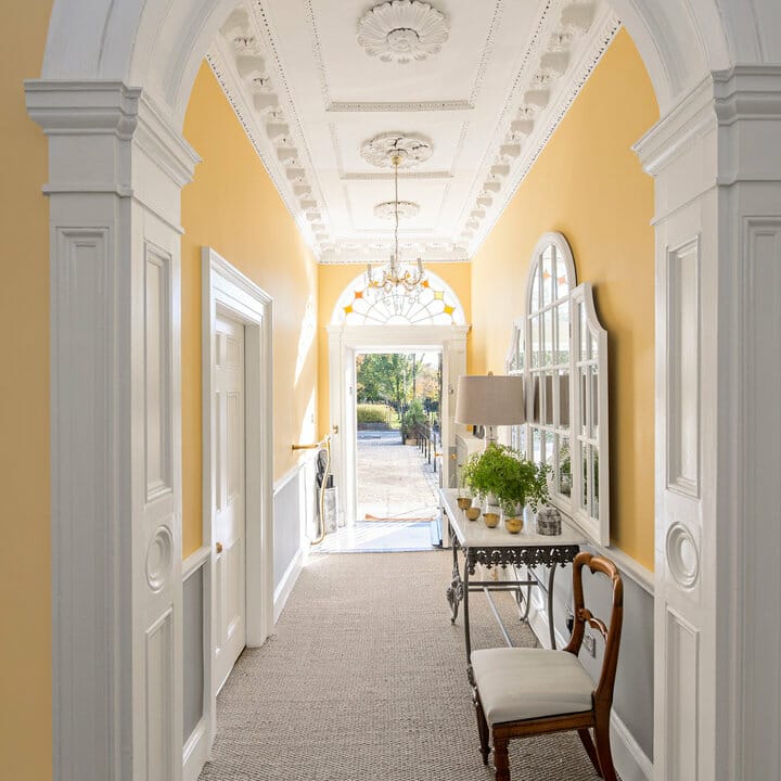 After painting the walls pastel yellow, coat the trim details, ceiling, and arch with bright white paint. Then, add a chair and console table to the corridor for an inviting vibe. Lastly, incorporate a houseplant and warm gray rug to generate a cozy feeling.