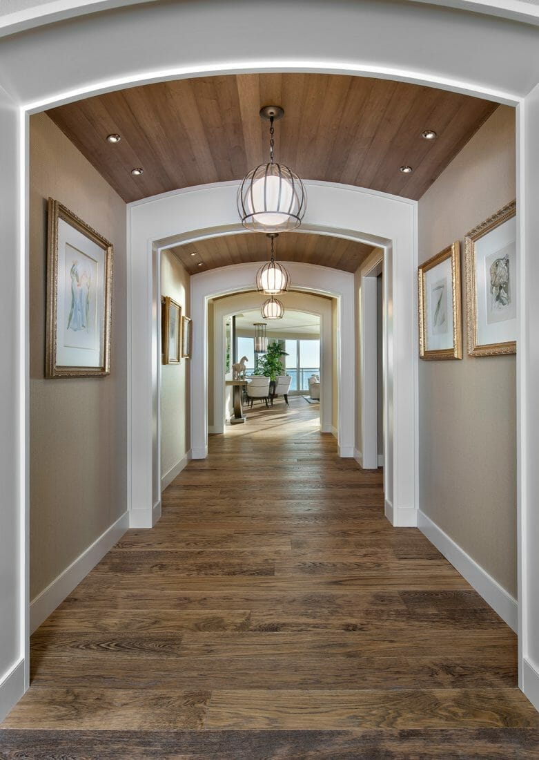 The white trim details and arch are an outstanding complement to azure blue walls. Additionally, framed artworks give the hallway interest.