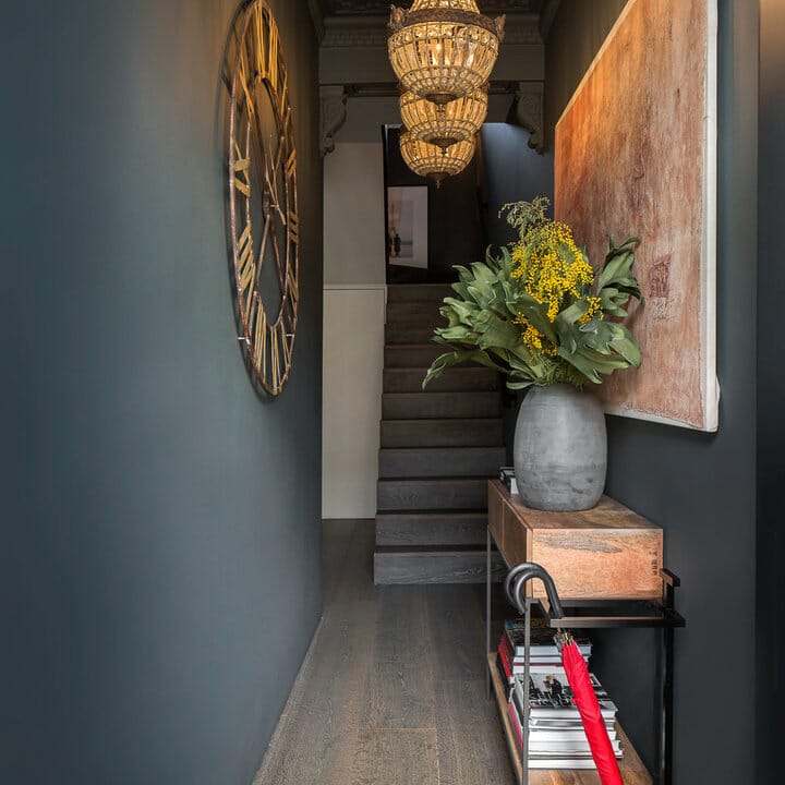 Speaking of paint colours for hallways and stairs, don’t be afraid of trying dark shades. Here, the passageway employs deep gray walls for serious sophistication.