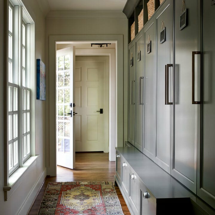 The deep grey creates a solid statement. Since the transitional space doesn’t receive any sunlight, you need something bright like crisp white. It will surely prevent the entire hallway from being too gloomy.