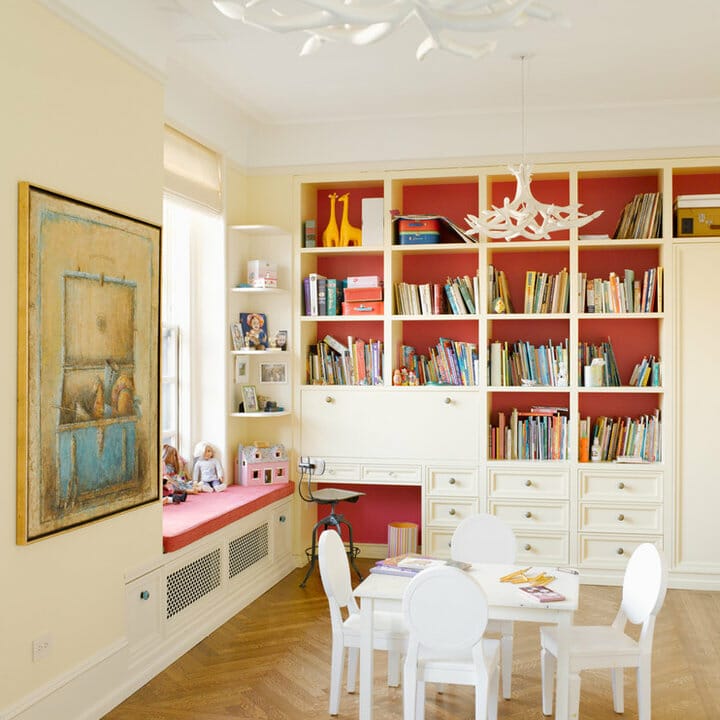Since this wall-mounted corner shelf comes in soft white, it mingles delightfully with the built-in bookcase and cream walls. The unit gives the child’s playroom a modern touch due to its clean lines.