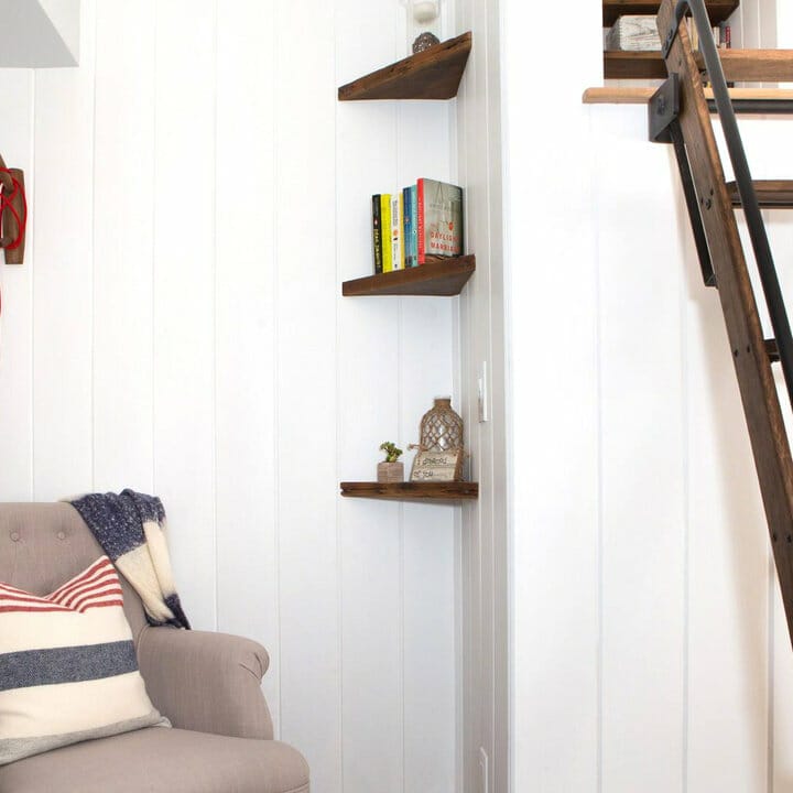 Here, the dweller mounted her DIY corner shelves to the walls in an alternating manner. They keep the room appealing and airy, too. In addition, the pieces inject a shabby chic flavor into the interior in seconds.