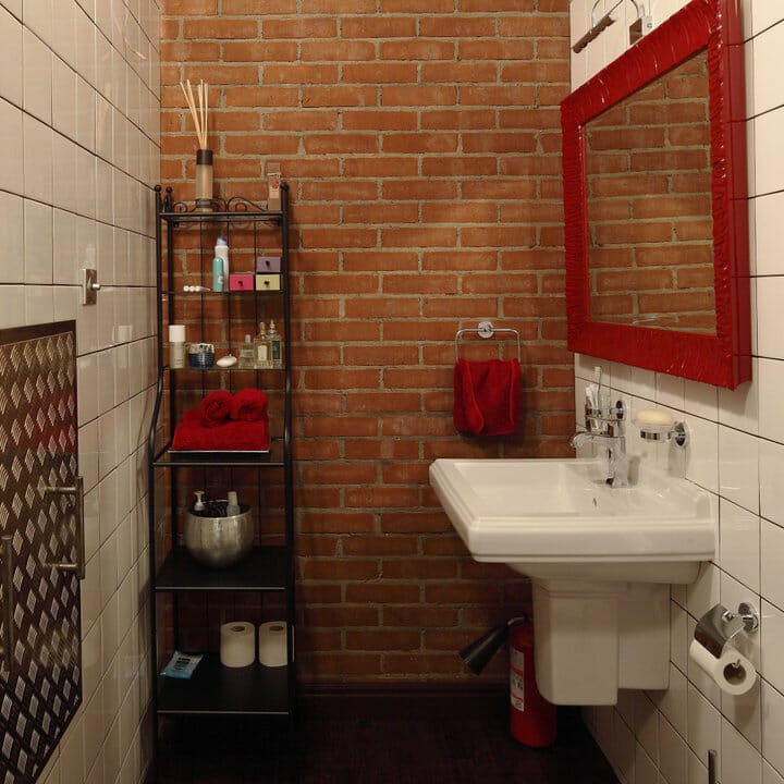 This black freestanding corner shelf imbues the powder room with drama. Furthermore, the exposed orange brick wall poses as a cool yet rustic backdrop for it.