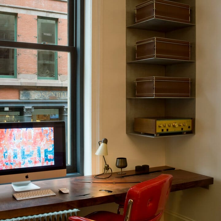 Due to white walls, the steel corner shelf seems more visible. Moreover, it holds a vintage amplifier and streamlined storage boxes. The red chair and rich wood desk absorb the unit’s coldness.