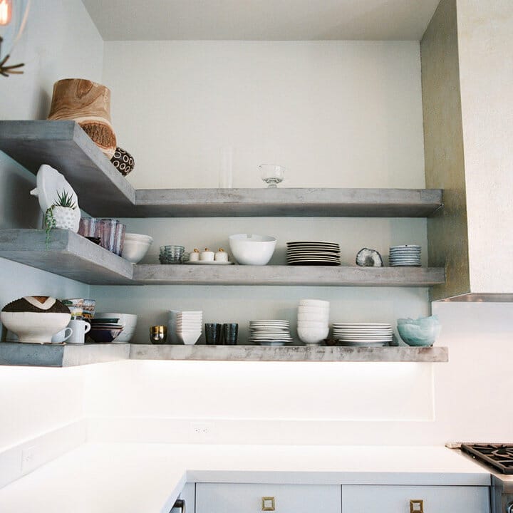 Need corner shelf ideas for kitchens? If yes, copy this cooking area’s look. Here, polished concrete L-shaped shelves keep the corner from becoming neglected. In addition, they infuse an urban touch into the interior.
