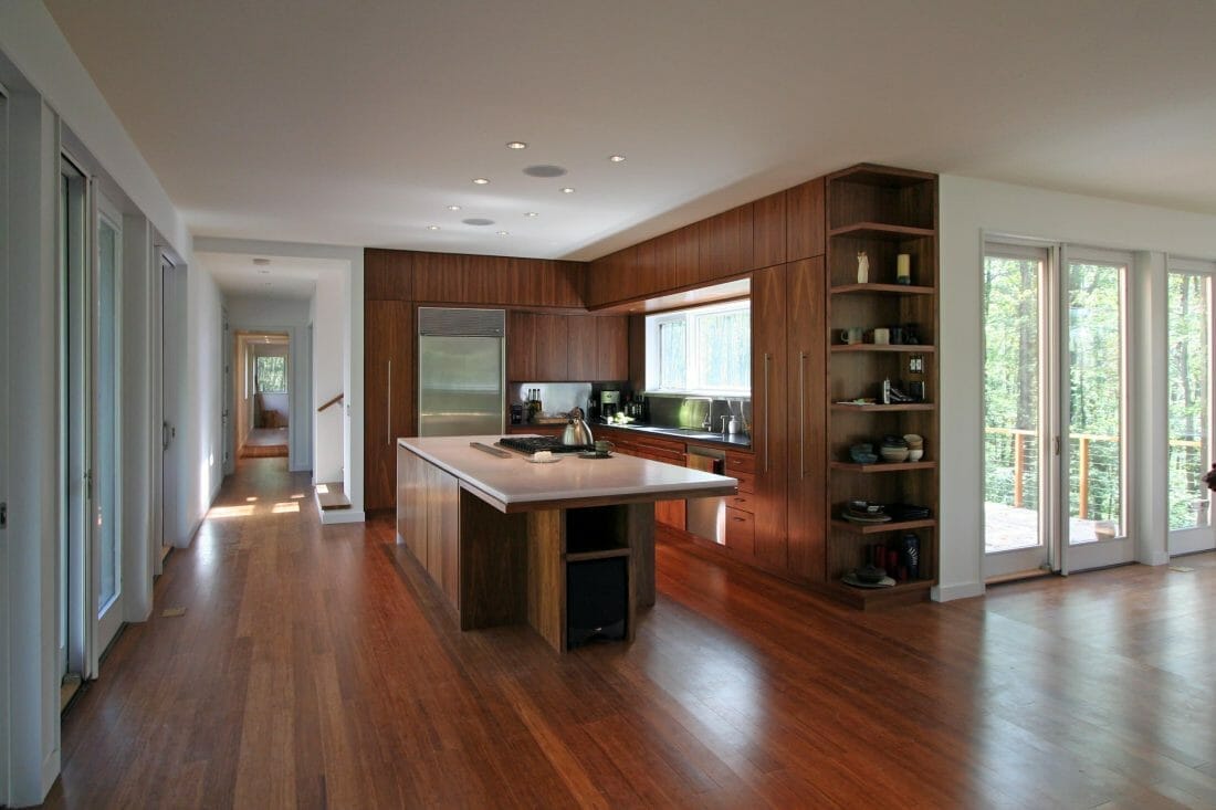 Due to open corner shelves, the culinary space gets more trendy. Furthermore, they give the kitchen personality and organic warmth.