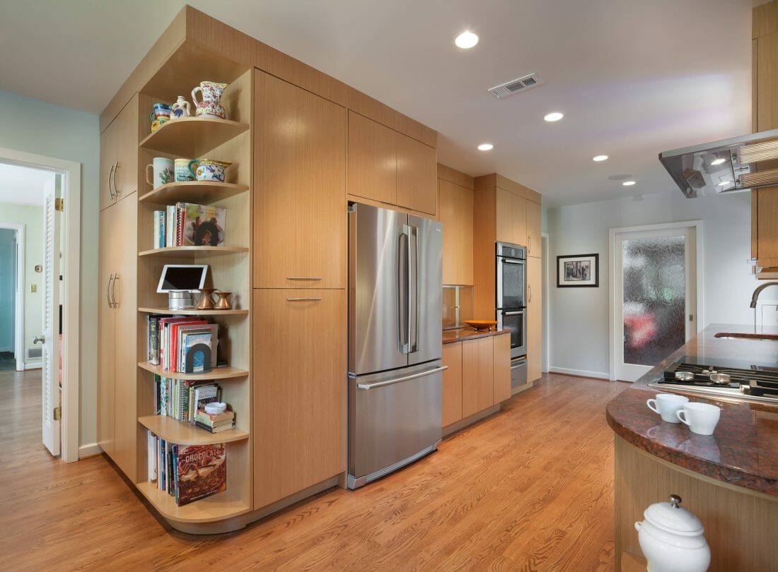 The built-in blonde wooden corner shelf absorbs silver stainless steels’ coldness. Moreover, it holds copper ornaments, books, and striking jugs.