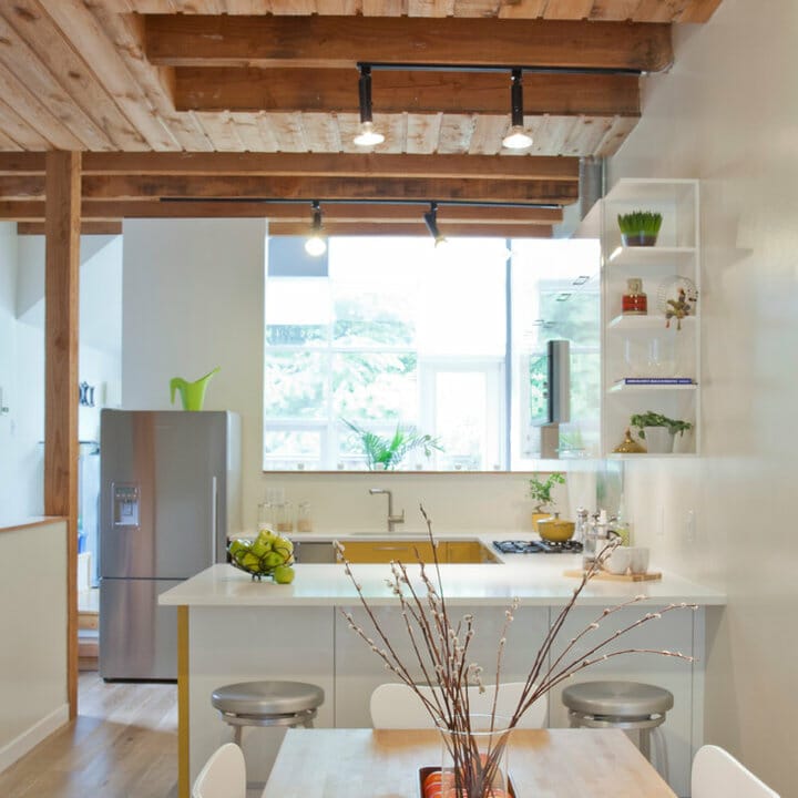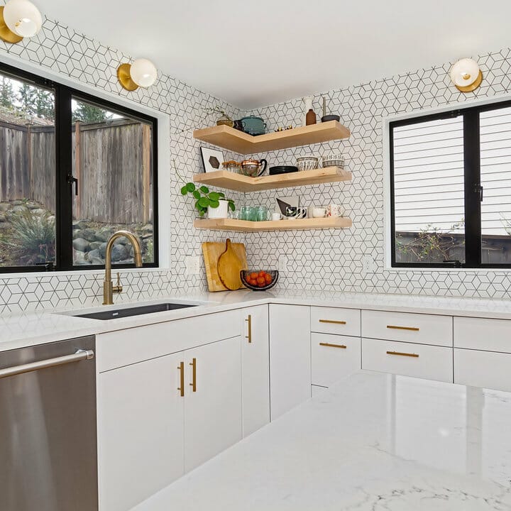 These L-shaped floating corner shelves maintain the kitchen’s airiness. Apart from delivering personality, they let you create crucial storage space. Moreover, bright white walls call attention to them.