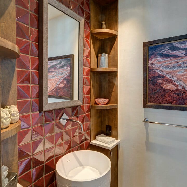 This powder room seems welcoming because of the painting and textured red backsplash. Also, the mirror with a weathered frame makes it bigger.