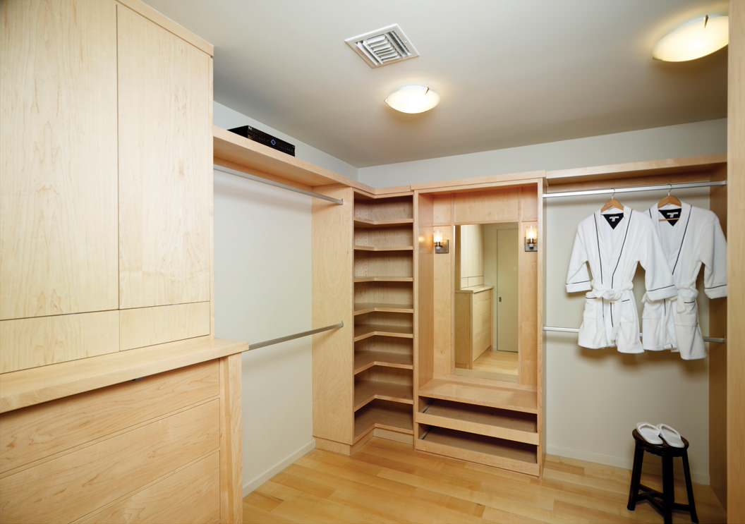 I adore this minimalist but magnificent closet. In addition, it employs white walls and sleek, blonde wooden corner shelves.