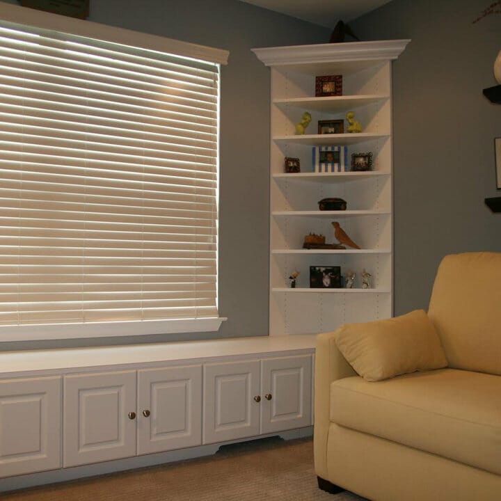 Speaking of corner shelf ideas, you won’t go wrong with crisp white paint. Here, the white corner shelf, cabinetry, and trim make the bedroom appear larger and brighter.