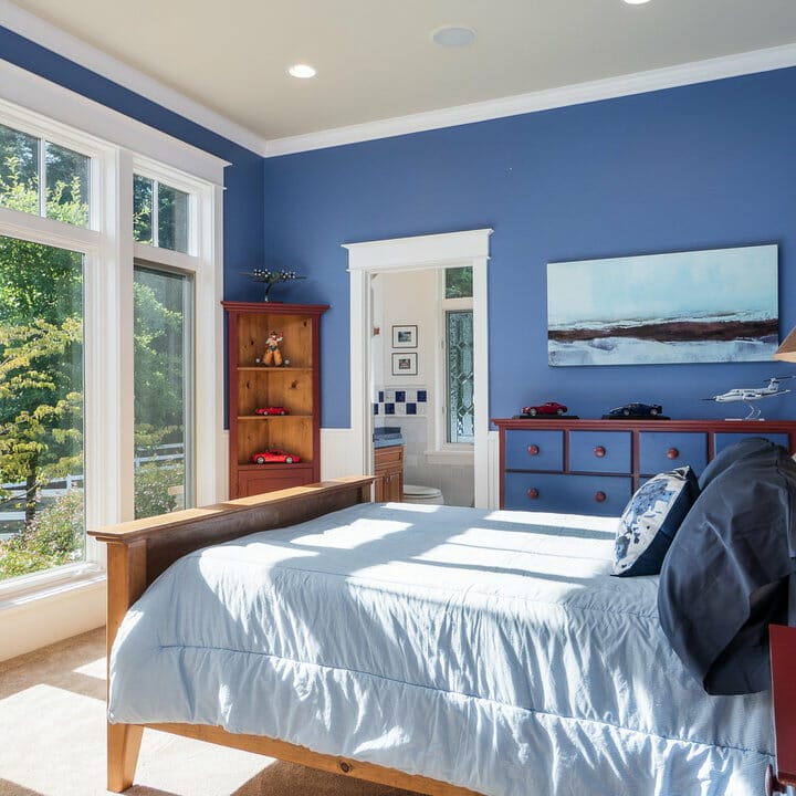 This teen boy’s sleeping space is super airy. Moreover, stark white and blue elements generate a splendid juxtaposition. Additionally, they maintain the room’s fresh ambiance.