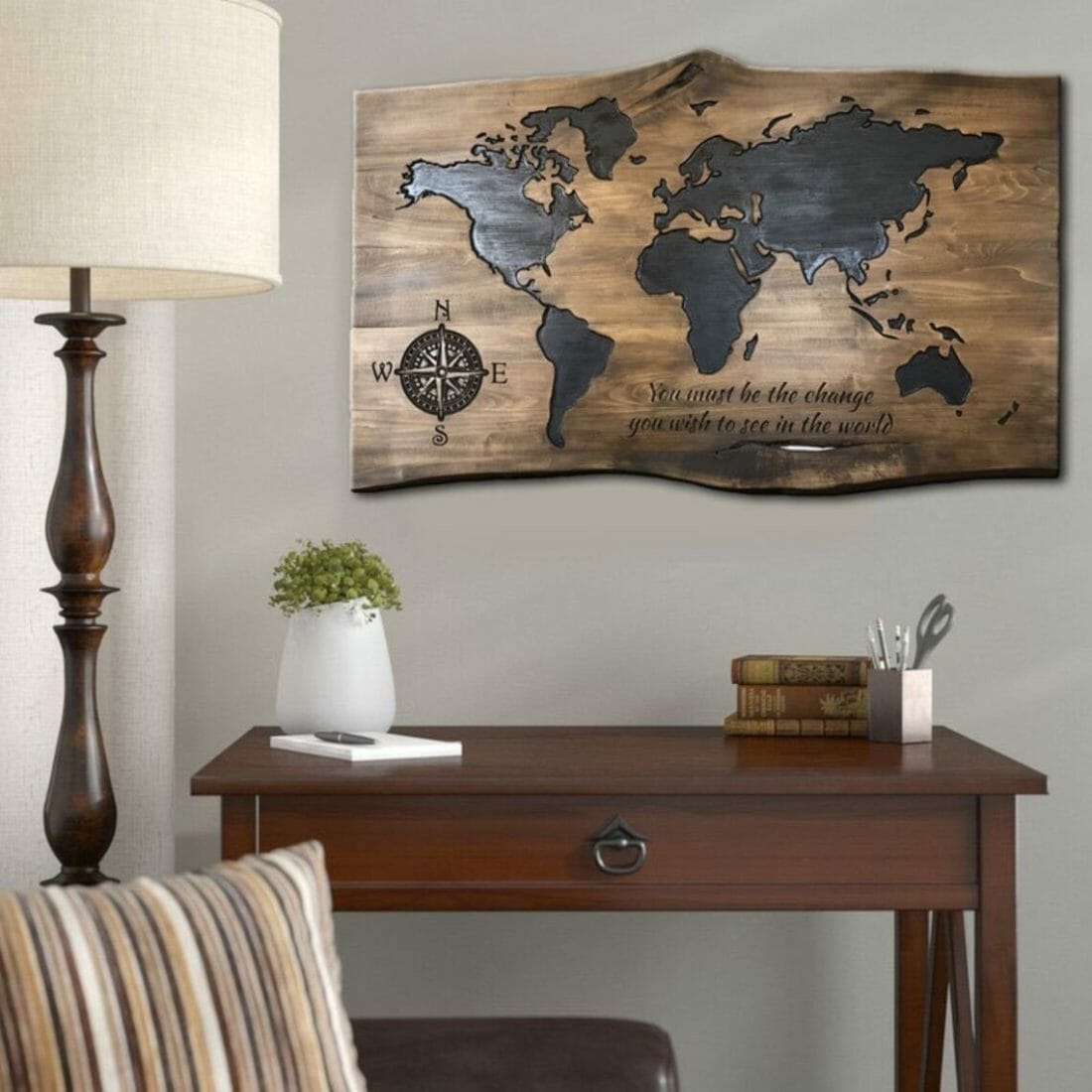 Here, the wood-burned map jazzes up the pale gray wall. It mingles with the vintage wooden desk, books, and floor lamp as well. Meanwhile, the neutral striped throw pillow and greenery make the home office feel complete.