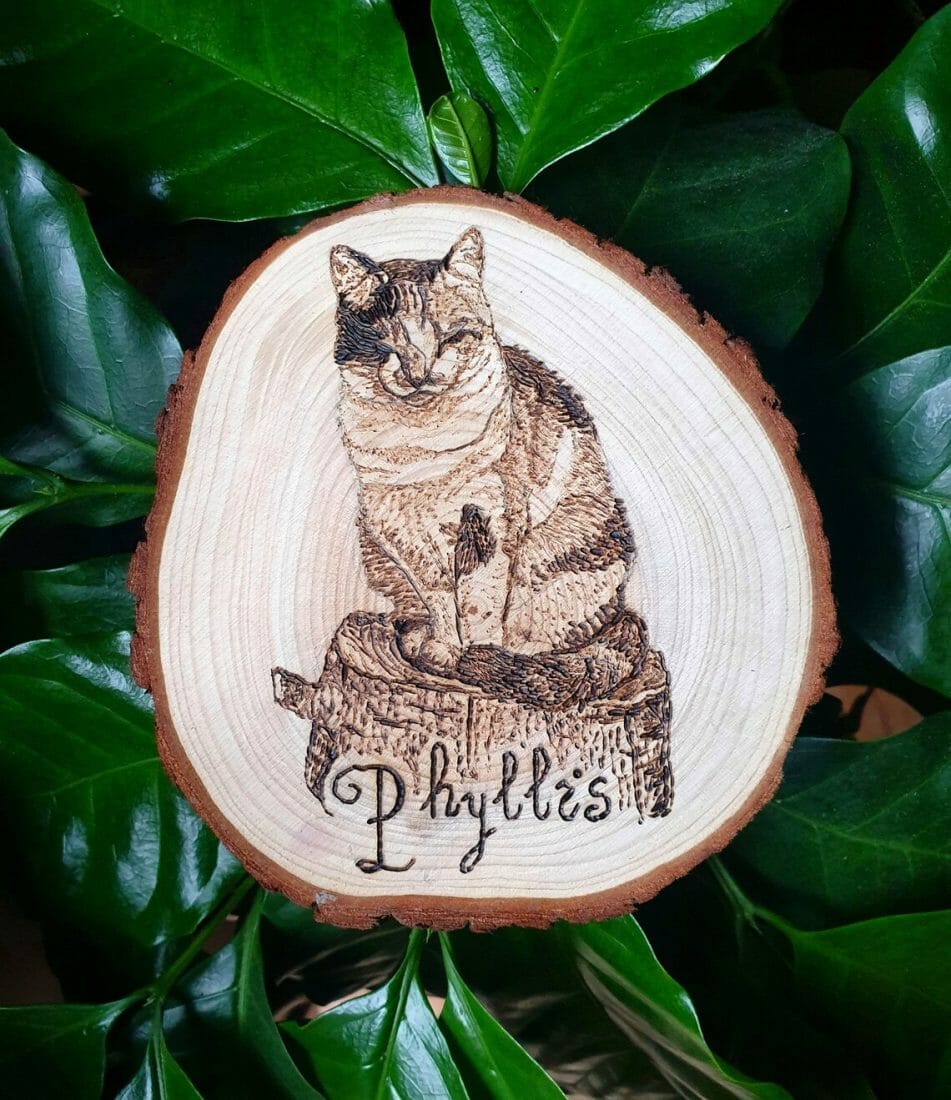 This wood-burned art piece features an innocent cat sitting on a tree stump. As you see, it’s unbelievably detailed. There’s the cat’s name too.