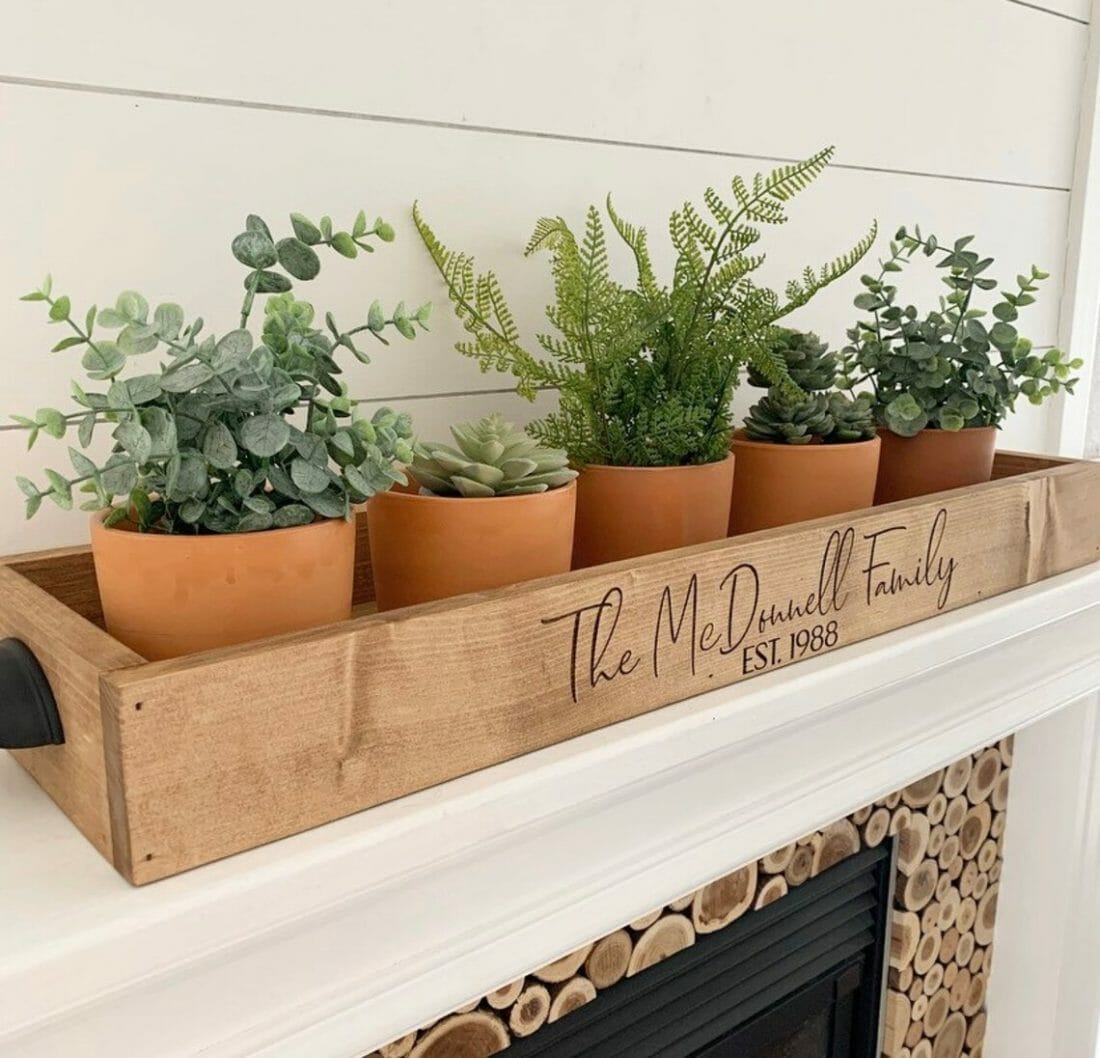 As you see, the medium walnut stain spices up the bare wood object. Furthermore, the personalized planter tray displays the family’s name. It also showcases the year of the family establishment.