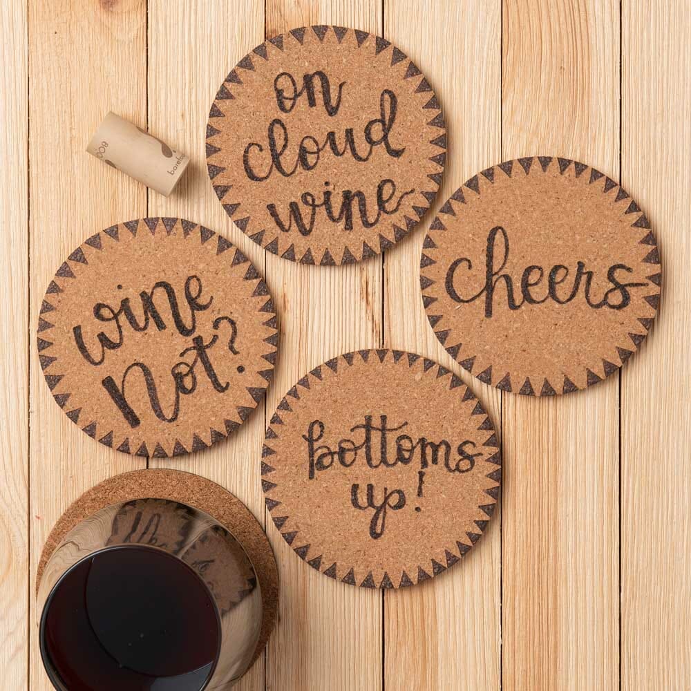 Regarding cork coasters, I have a few wood-burning tips. Cork is less durable than solid wood, so it requires a lower temperature. No worries, though. The results are equally fantastic.