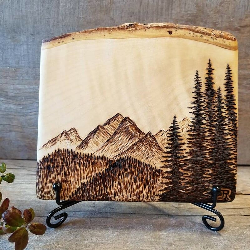 This wood-burned artwork displays a jaw-dropping landscape. Moreover, the pyrography artistry gives a slab of wood some personality.