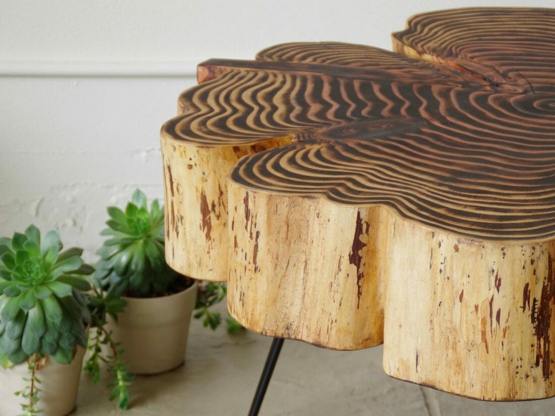 Wood burning successfully makes this tree slice coffee table an accent furniture item. Apart from adding a sense of personalization, it gives off striking details.