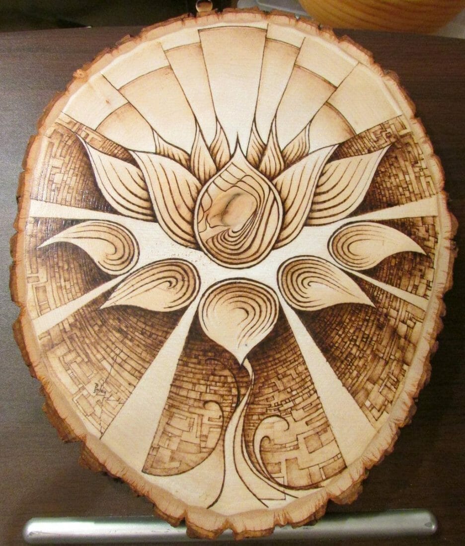If you love drawing mandalas or coloring them, this is one of the wood-burning designs for beginners to copy. This art piece combines a pyrography design and mandala.