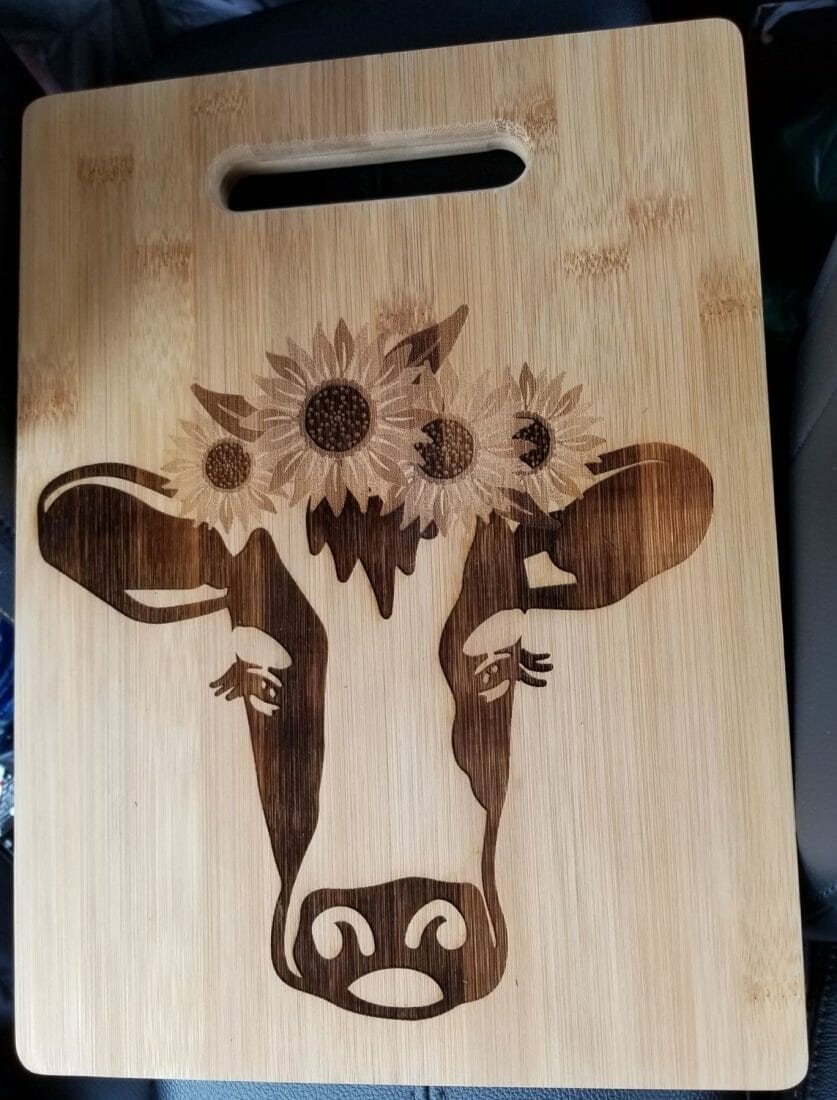Here, the farmhouse cutting board employs a mesmerizing pyrography design. The unstained wooden object allows the wood-burned cow head art to steal the spotlight.