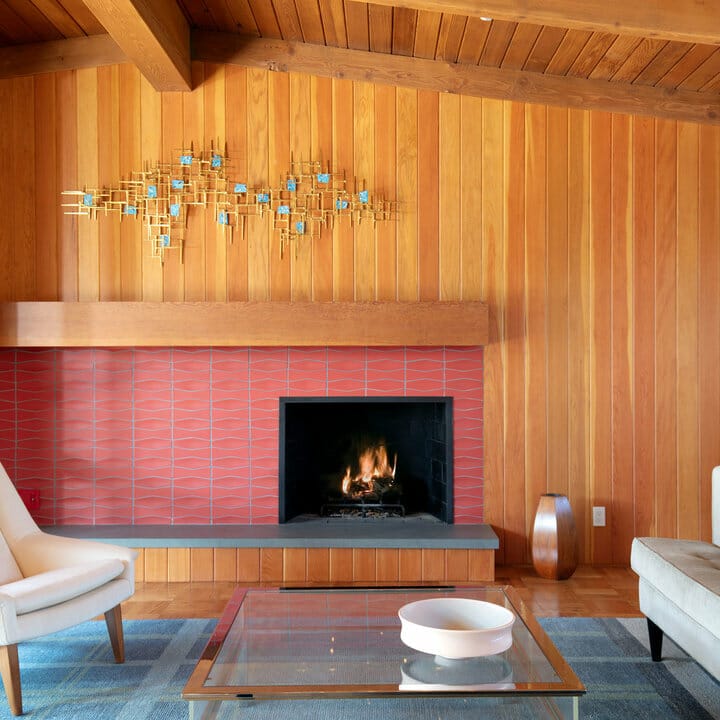 This sitting room, for example, employs square tiles in varying coral shades. They deliver a pop of color while keeping things homey. Lastly, scenery-inspired embossed tiles call attention to the potted greenery.