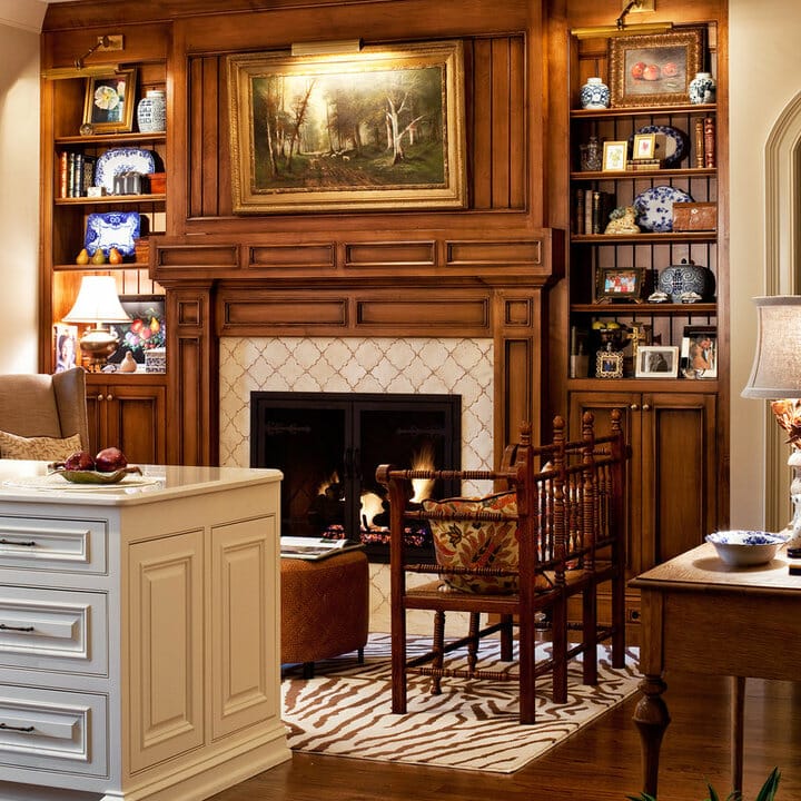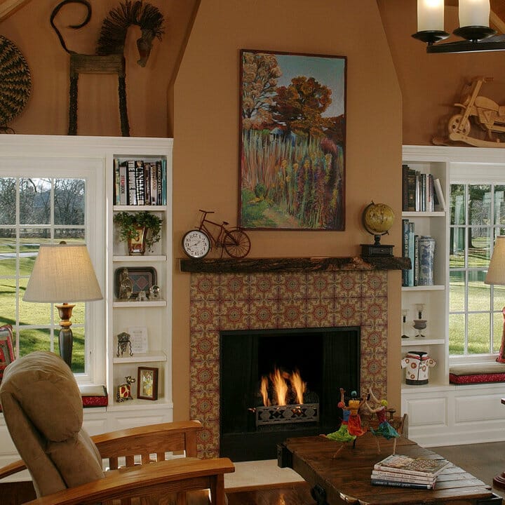 Fireplace tiles pull in all the earthy tones in the room for a cohesive look. Meanwhile, the white mantel highlights them while adding old-world craftsmanship.