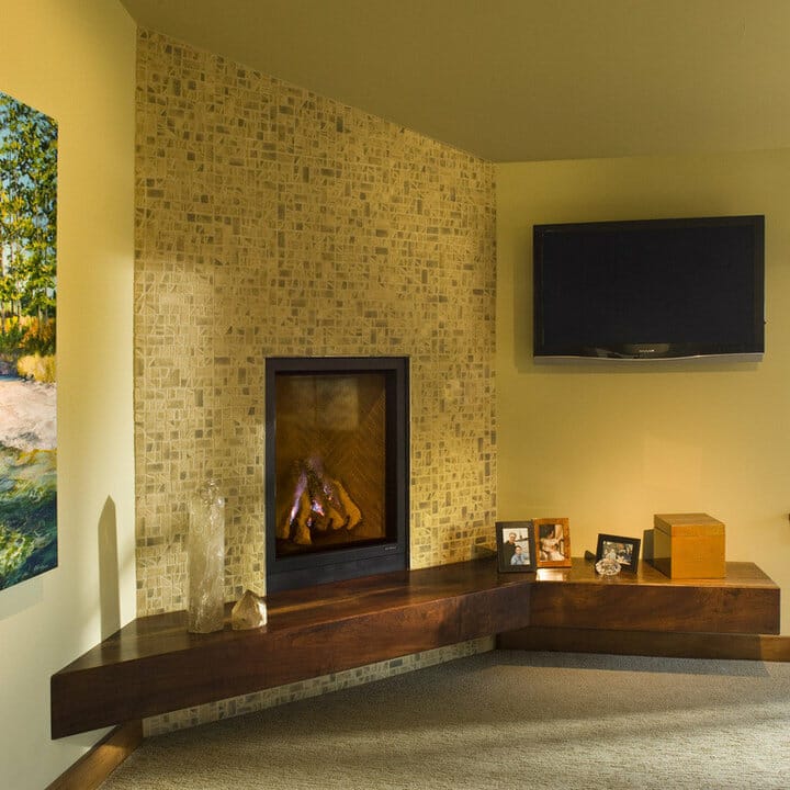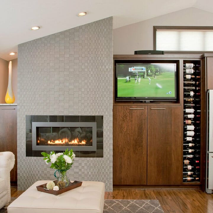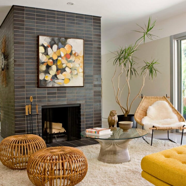 Here, mini natural stone tiles lend the fireplace a modern appeal. Furthermore, they showcase gorgeous tonal variations, from pale gray to medium-toned brown.