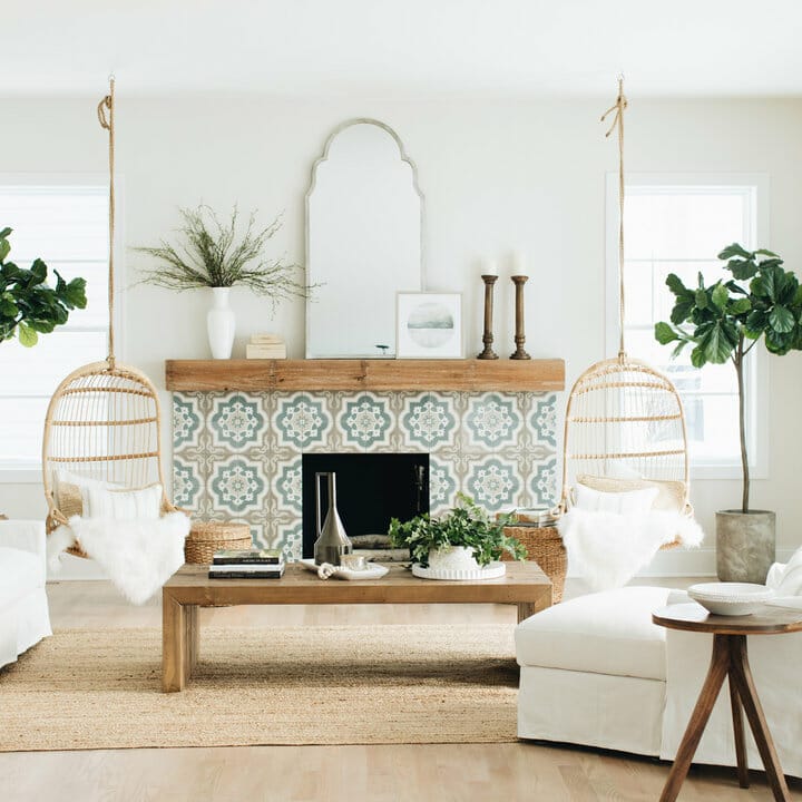 There’s a rustic wood fireplace mantel right above Spanish tiles. Meanwhile, the rug, wicker baskets, and rattan swing chairs heighten the coastal atmosphere.