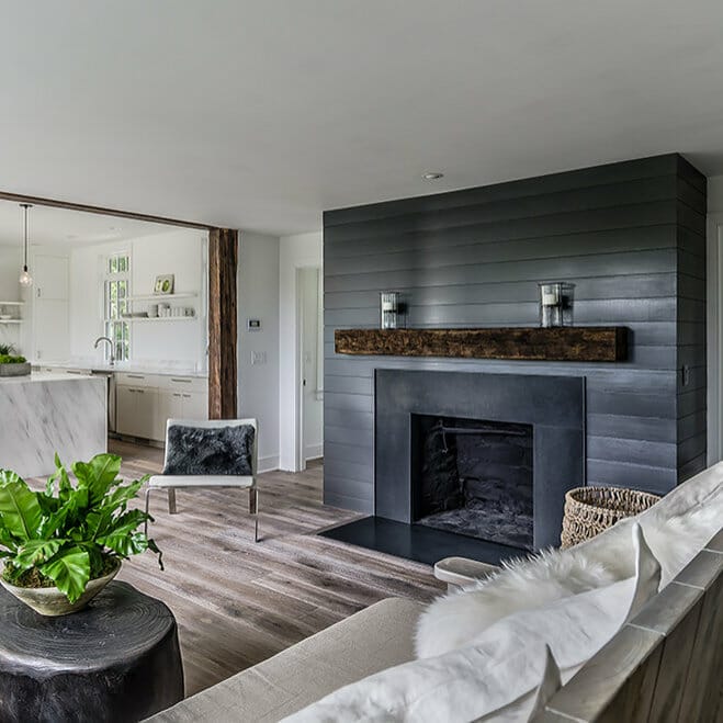 The fireplace facade features deep gray-painted wooden planks. The units heighten the living room because they extend from the floor to the ceiling.