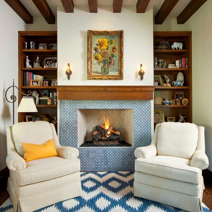 Blue and white patterned tiles decorate the fireplace facade. In addition, they deliver a classic Spanish aesthetic to the living area in no time.