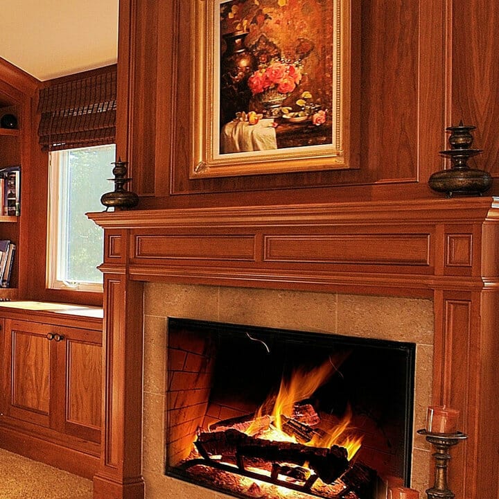 The mantel offers a touch of old-world craftsmanship. Moreover, it accentuates the beige granite tiles while letting decorative pieces shine.