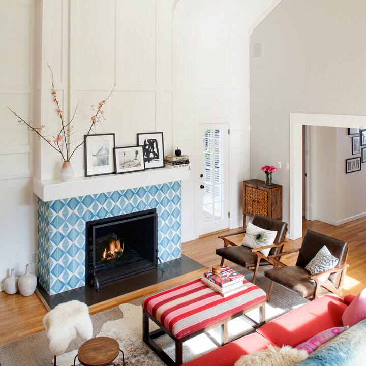 Here, white and blue geometric tiles modernize the look of the fireplace. In addition to turning guests’ heads, they produce a fresh ambiance.