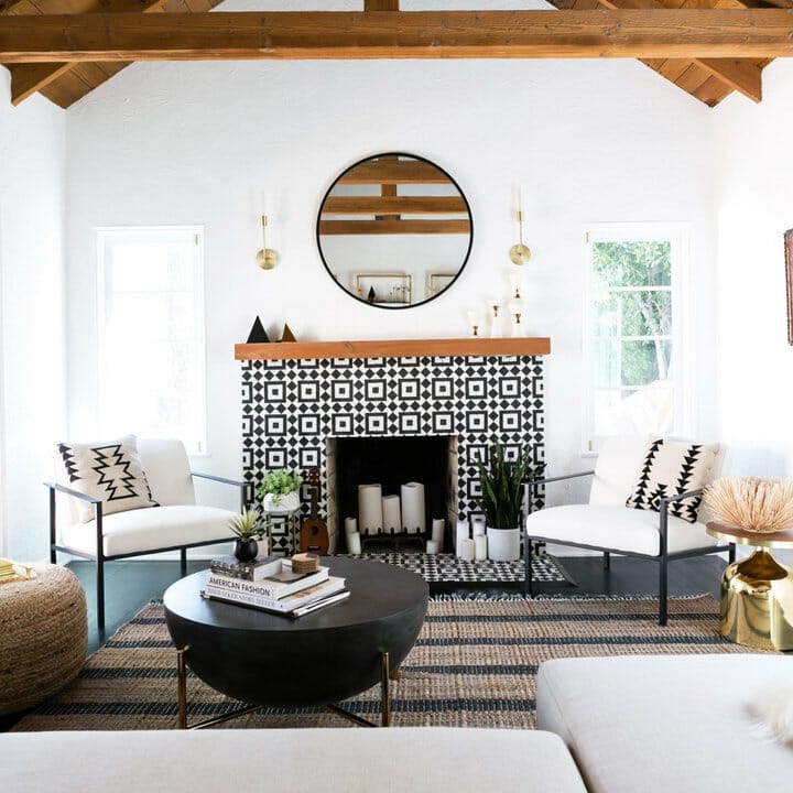 Need decorative fireplace tile ideas? In this photo, geometric black and white tiles make the sitting area more stylish and visually pleasing. They complement printed throw pillows while serving as a centerpiece.
