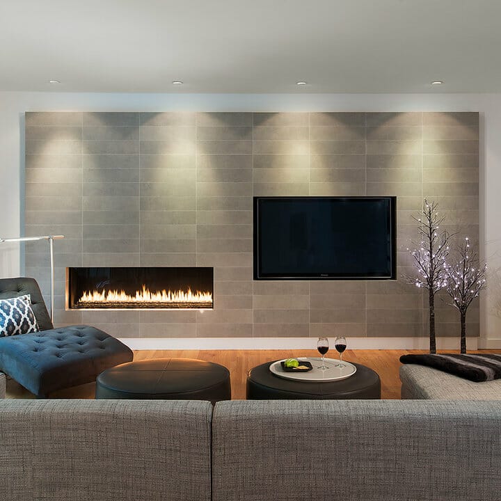This is one of the incredible minimalist fireplace tile ideas. Gray rectangular tiles with indistinct grouts keep things looking trendy and serene. Also, they carry a cool element to the modern living area.
