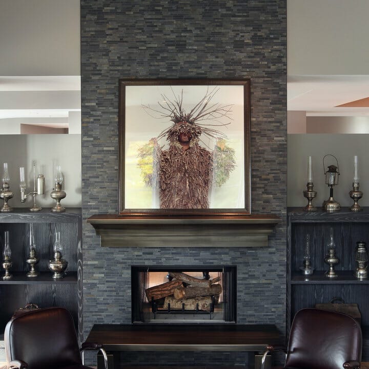 Gray-painted built-ins display wood grains to accompany the natural beauty of fireplace tiles. Meanwhile, the artwork and vintage mantel complete the look.