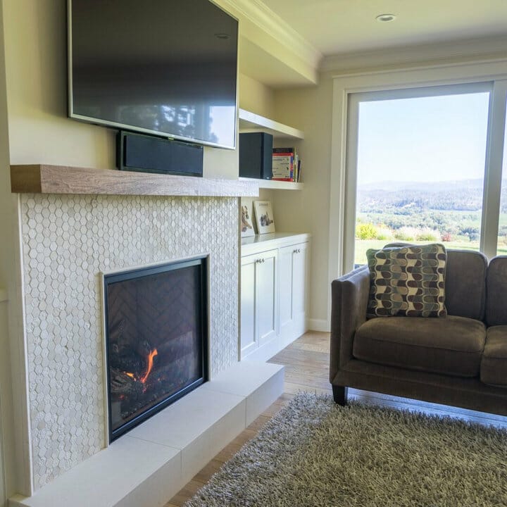 I can’t stop adoring the facade of this fireplace. The hexagon mosaic tiles come in warm white. They emanate a serene vibe while updating the living room’s look, too.
