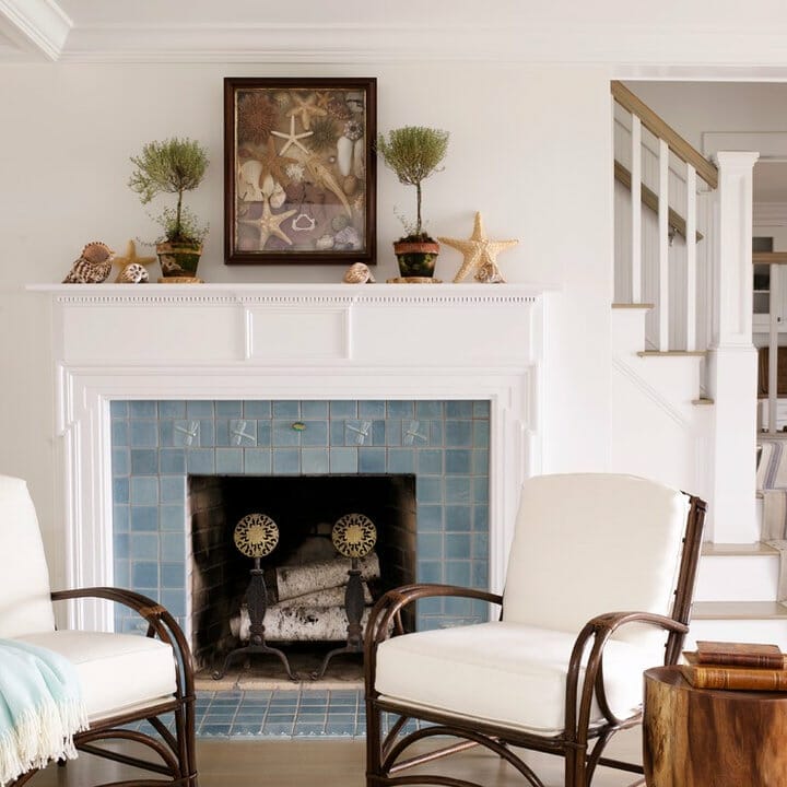 Here, the crisp white traditional mantel contrasts with the blue vintage tiles. Also, it lets coastal ornaments catch the eye.