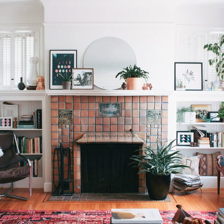 Brand-new tiles aren’t your only choice. Consider installing vintage square tiles. In this example, they beautify the hearth and facade of the fireplace.